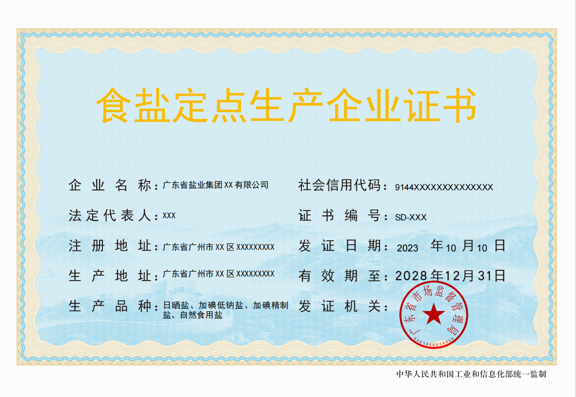 | 可办理具体条件 | 1、在中华人民共和国境内具有法人资格;2、广东省境内已获得食盐定点生产企业证书;3、拥有自有的或其他食盐定点企业经合法程序许可使用的食盐注册商标;4、具备持续开展正常生产经营活动的技术和设备设施条件;5、食盐质量和安全管理应符合相关国家标准/规范要求;6、信用和储备管理符合规定;7、食盐生产及能力符合《食盐定点企业规范条件》《食盐定点企业规范管理办法》等法规要求。 | ||