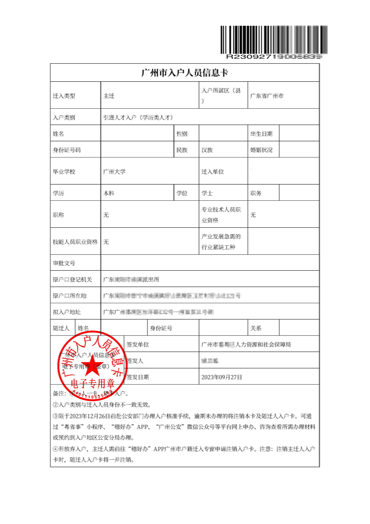 | 1 | 广州市人员入户信息卡 | 批文 | 批复样本.jpg | 广州市入户人员信息卡模板.jpg | 已关联电子证照 |