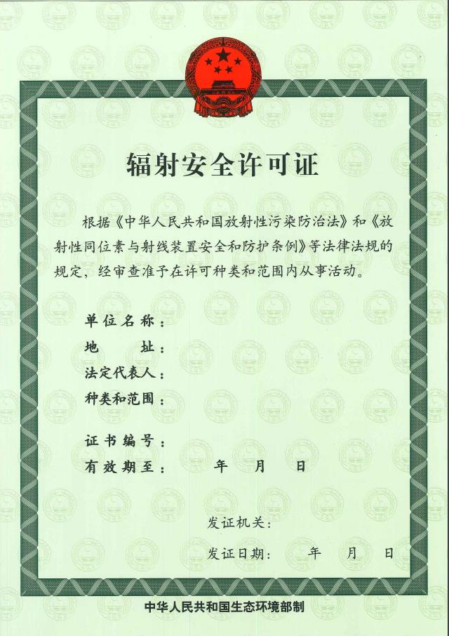 | 1 | 辐射安全许可证 | 证照 | 辐射安全许可证(空白).jpg | 辐射安全许可证(示例).JPG | 已关联电子证照 |
