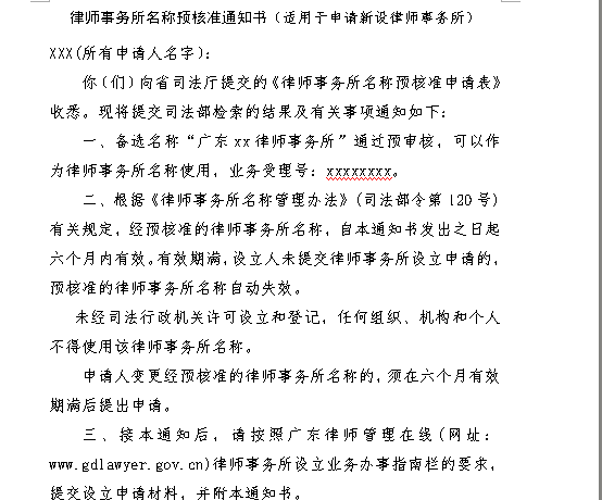 3、获取办理结果:省司法厅对受理机关上报的材料进行审核,符合审批条件的,上报司法部核准,省厅根据司法部核准结果制作通知书,制作名称预核准通知书,并在网上进行公告;不符合审批条件的,告知申请人重新选报名称。 同时经办人员根据书面材料审核结果,处理电子信息材料,生成相应办理结果。申请人登陆广东省政务服务网查询办理进度和审批结办理结果并打印名称核准结果通知书。
