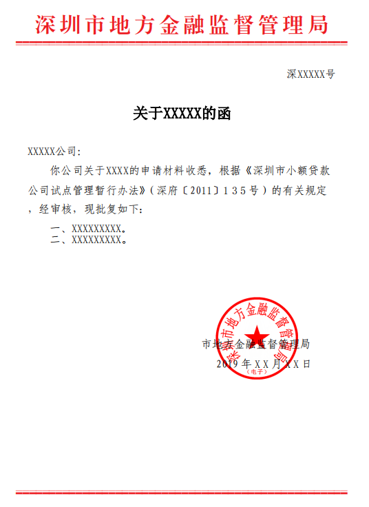 5.办结(当日):出具《关于批准深圳xxxx小额贷款有限公司业务资格的函》;不予通过的,出具《不予许可决定书》。
