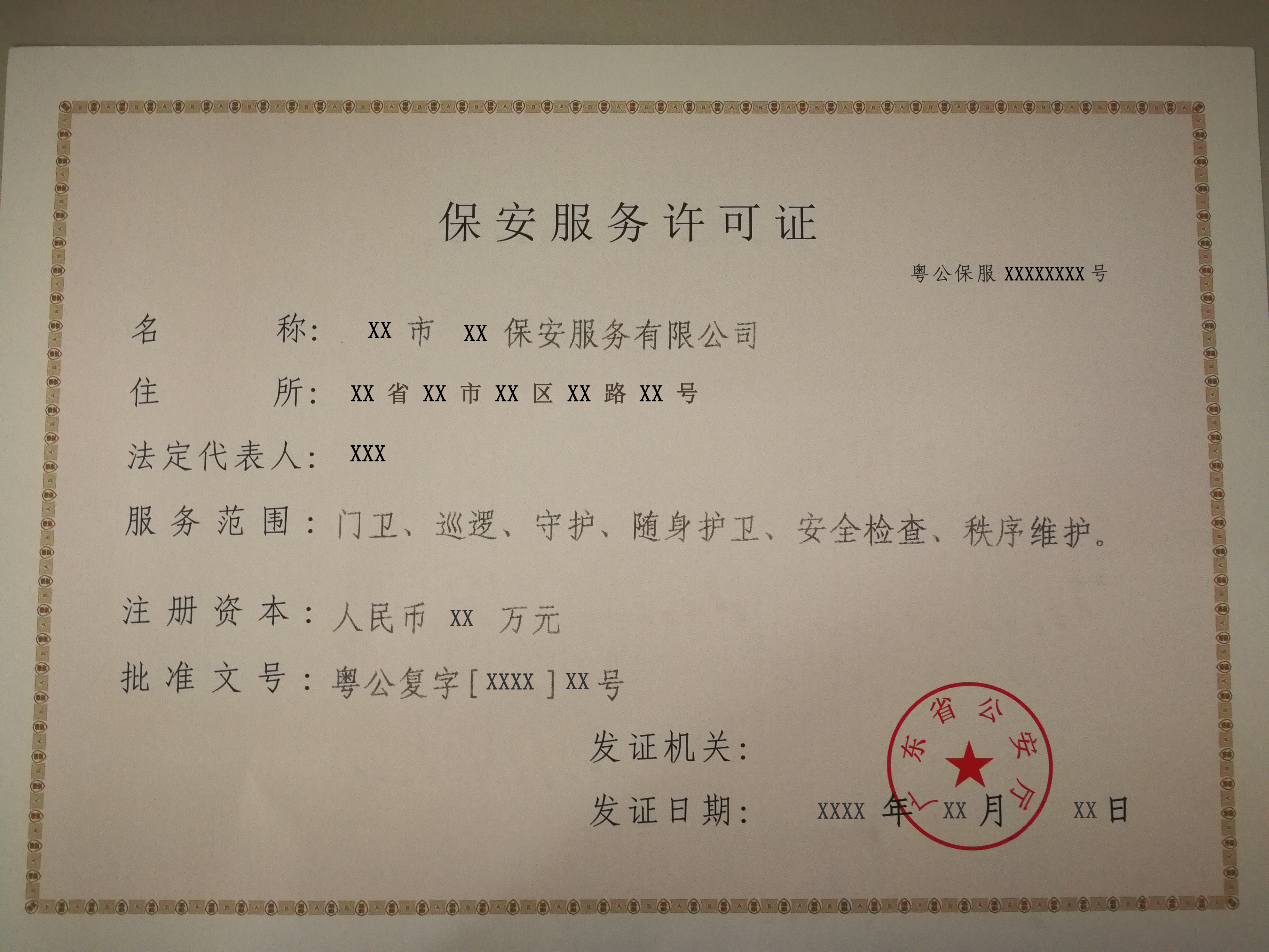 | 1 | 保安服务许可证 | 证照 | 保安服务公司设立许可.jpg | 保安服务公司设立许可样本.jpg | 已关联电子证照 |