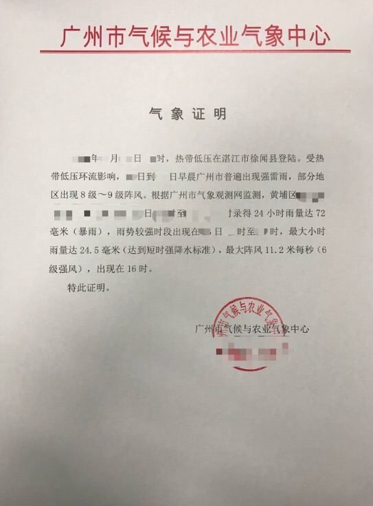 可办理具体条件 | 辖区内因天气原因(降雨、大风、雷暴等)引起的纠纷(如保险理赔、工期延误、责任区分等),或者因事故调查以及公安办案等需要提供气象证明材料,(备注:可开具范围为灾害性天气状况和预警信号发布情况,具体为九种:单时次降水气象证明、单时次大风气象证明、单日降水气象证明、单日大风气象证明、多日降水情况气象证明、单日高(低)温气象证明、多日高(低)温气象证明、预警信号发布证明、闪电证明,出具距申请日五年以内且连续时间不超过6个月的证明(预警信号发布证明连续时间可延长为1年),超出连续时间范围的可分开申请。超出以上要素种类或时间范围的按气象数据申请,请于工作时间拨打电话020-31166661咨询)。申请预警信号证明可在穗好办自助办理,(备注:穗好办渠道办理的,只能出具距申请日一年以内且连续时间不超过1个月的证明)。 |