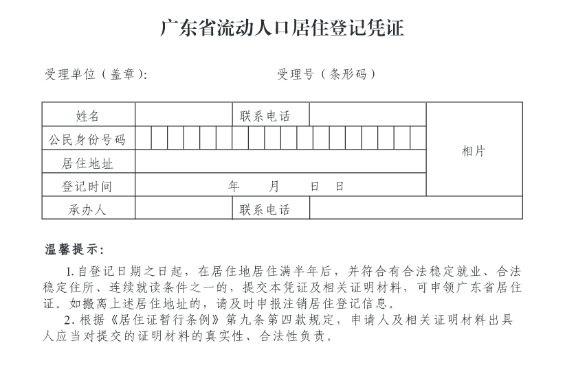 | 可办理具体条件 | 离开常住户口所在地,进入广东省和广东省行政区域内跨地级以上市居住的公民,应当自到达居住地之日起三个工作日内申报居住登记。 | ||